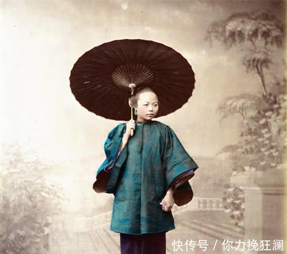 图1,一个女子正举着伞,站着拍照呢,明显可以看出来是摆拍,因为后面的背景一看就是假的,不过应该是很有钱的样子,带着个翡翠耳环,给人一种很大气的感觉。看她没有裹小脚,应该是满族的女子,因为清朝的汉族大部分还是裹小脚的。