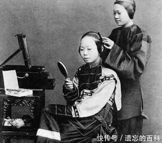图为一名官员的千金小姐和她的丫鬟,那时候女性的发饰比较单一,而镜子却还是用的痛镜,
