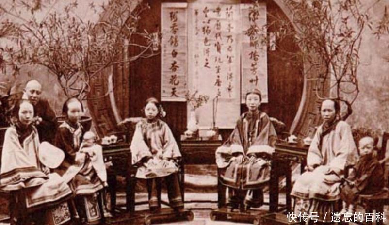 图位清朝大户人家的合影,端坐的五位女性是户主人的五位太太,如此妻妾满堂,足以看出他官居要职,