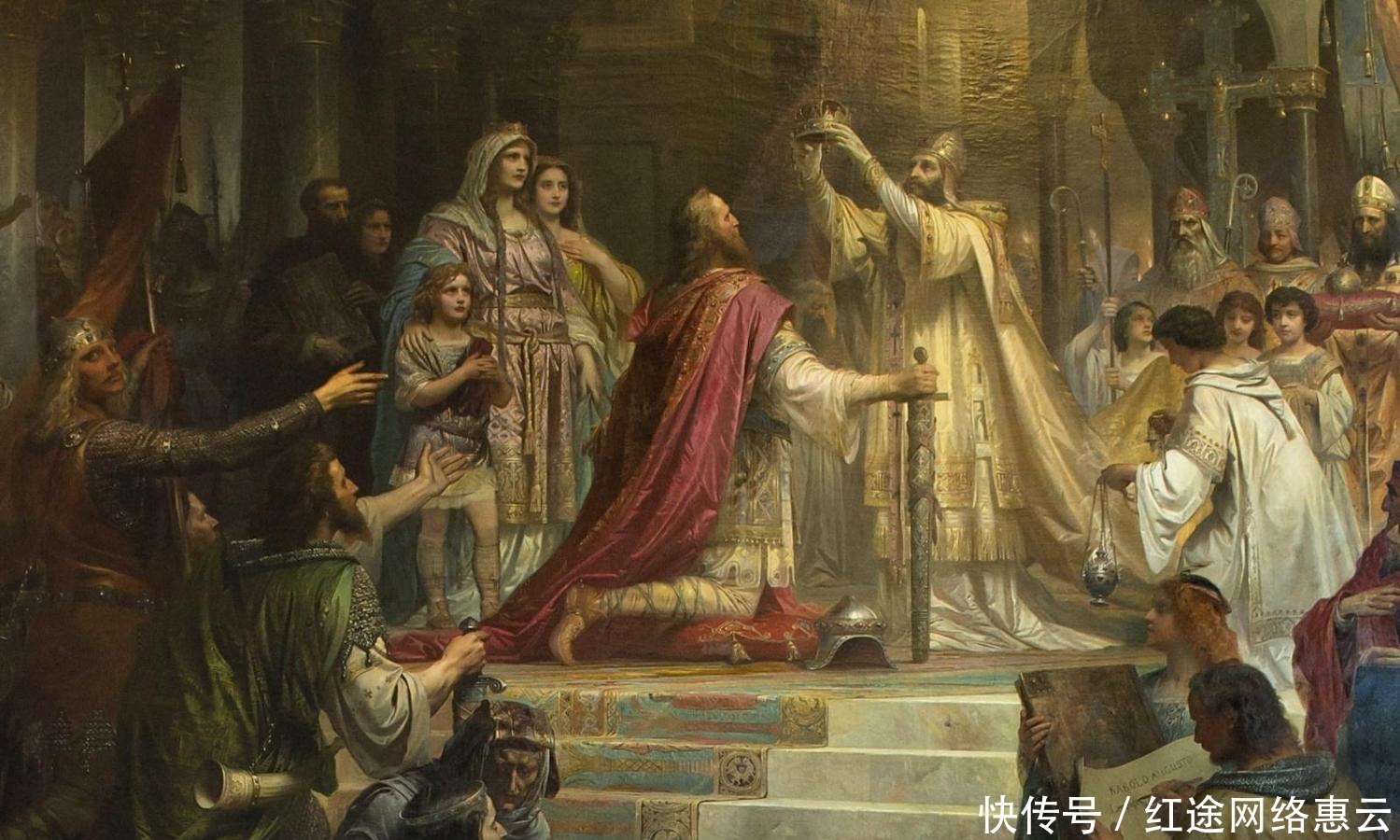 查理为了强化自己在宗教上的力量,与教皇结盟,帮助教皇利奥三世复位。公元800年,罗马教皇利奥三世对外宣布查理是罗马皇帝,并为他加冕。"查理国王"由此变成了"查理曼",而这个"曼"就是大帝的意思,这让查理曼帝国的地位空前提高。