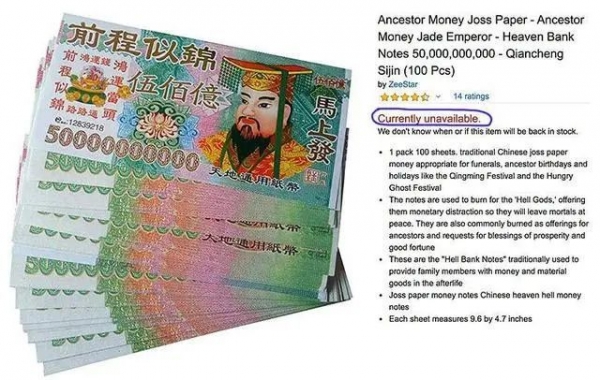 比如亚马逊上就有各个版本的冥币,你只要搜索“祖先钱”,就可以看到一堆冥币蹦出来了,而且订单都异常多,甚至还卖断货了,除此之外,不少平台或直播间还会教你怎么样来烧纸钱,以及烧纸钱时的一些注意事项等等,所以根本不用担心外国人不会用。