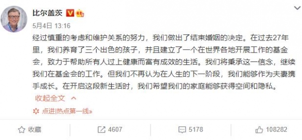 根据离婚声明,他们是经过深思熟虑后做出这个决定的。我们以后会一起继续基金会,但是没有办法以夫妻的身份一起度过下半辈子,同时我们敦促公众尊重他们的隐私。