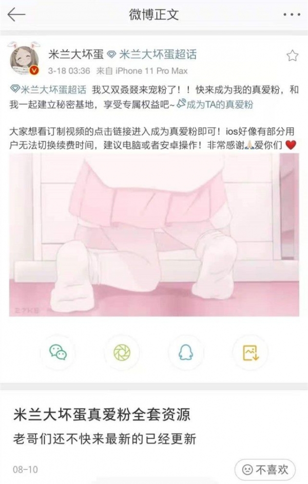 随着熊猫直播倒闭,米兰失去工作后似乎没有找到其他平台,还曾向粉丝售卖自己录制的性感视频和照片。