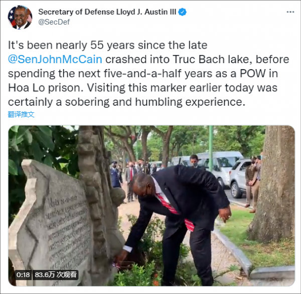 据越南媒体VnExpress消息,奥斯汀还访问了曾经在越南战争中关押包括麦凯恩在内的美军战俘的火炉监狱原址,该建筑在1993年被改建成办公大楼和历史博物馆。