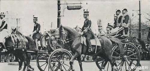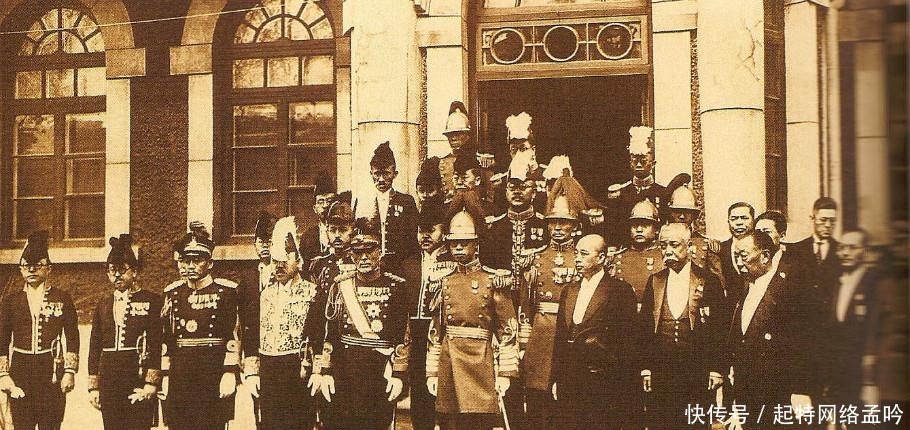 1934年,溥仪在"新京"南郊杏花村举行登基典礼,将"满洲国"改为"满洲帝国",他也有"执政"变成了"皇帝"。图为登基后的溥仪和伪满洲国幕后统治者关东军司令官菱刈隆(左5)等合影。