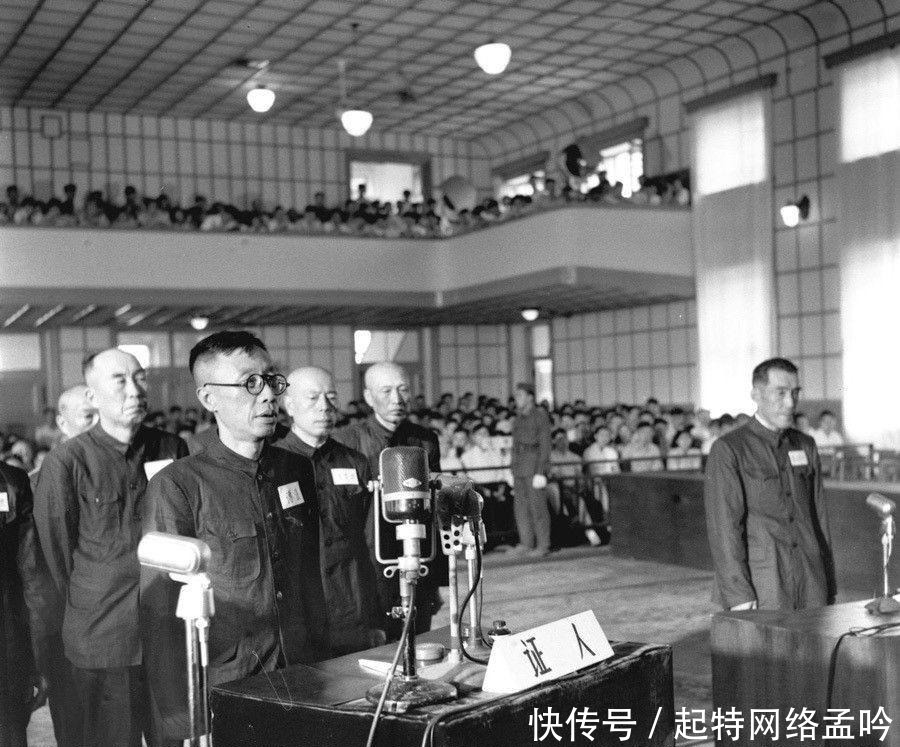1950年,溥仪被引渡回国。1956年7月1日,最高人民法院特别军事法庭在沈阳开庭,审判武部六藏和个古海忠等28名日本战犯。图为前伪满洲国皇帝溥仪在法庭上作证,右为被告人古海忠。