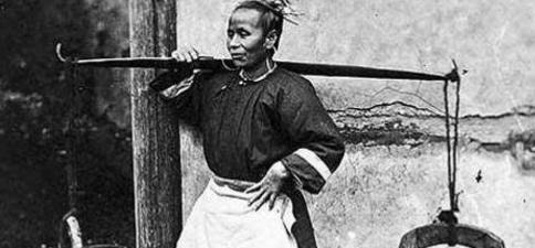还原人们的生活,与电视剧的光鲜亮丽一点都不一样!一个带着围裙的女人在跳着扁担,扁担上有两只水桶!