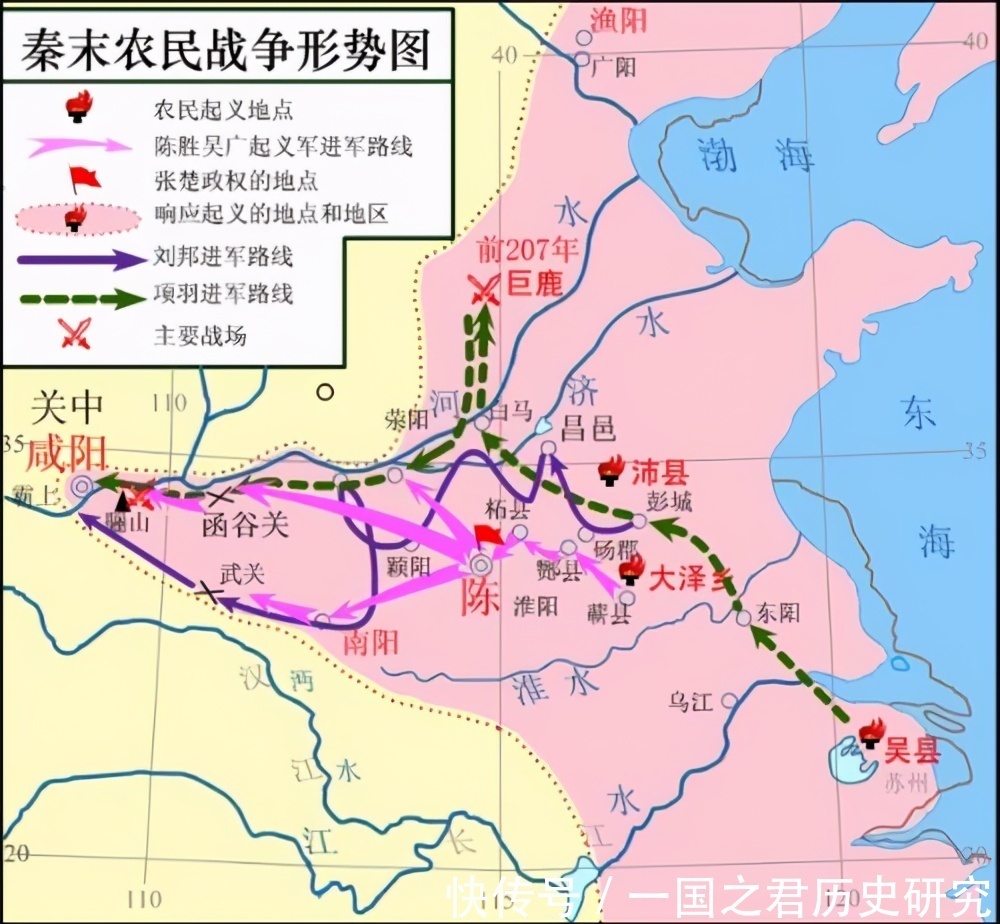这种趋势用现在的话说,就叫"风口",站在反秦的风口上,连猪都会飞,所以只要你反秦,在当时就代表正义和趋势,连很多秦朝的地方官都跟着这股真挚走,可见天下大势的力量多么强大,而且当时的反秦是仇视秦朝的一切,等于是把所有的政治结构和上层建筑全部推倒重来,那些依靠反秦起家的农民和六国遗民们,等于是新崛起的贵族,跟原本秦国的贵族完全不是一批人了。
