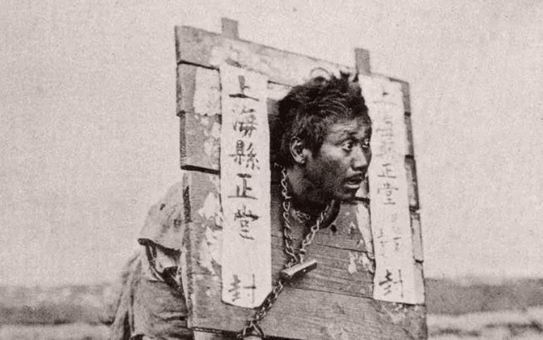 1874年,在中国上海县,戴着枷锁的一名中国男子,看来他的罪行不轻