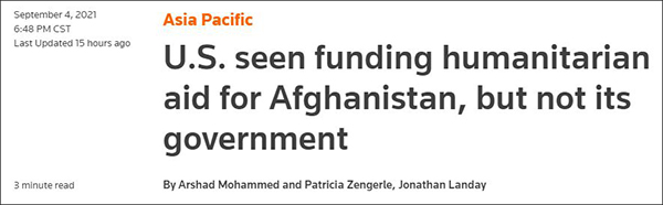 另据路透社当地时间4日晚消息,尽管美国国会两党人士表示可能会向联合国等国际机构提供用于人道主义援助阿富汗的资金,但不会向塔利班当局提供援助。