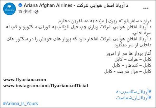 该公司称,喀布尔与该国西部赫拉特省首府赫拉特(Herat)、北部巴尔赫省首府马扎里沙里夫(Mazar-i Sharif)和南部坎大哈省首府坎大哈(Kandahar)之间的航班已经恢复。声明还称,"阿里亚纳航空公司很自豪能够恢复国内航班。"