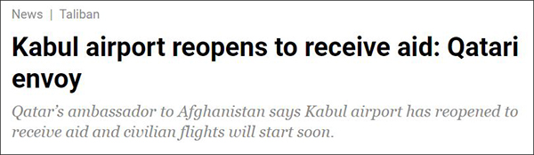 而由卡塔尔政府派出的一支技术专家团队已于本月1日飞抵喀布尔,协助检查喀布尔机场设施受损情况。一名熟悉情况的人士说,卡方为塔利班提供协助主要是为了让人道主义物资能够进入阿富汗,并为人员自由流动提供便利,包括重新启动"人员撤离"。