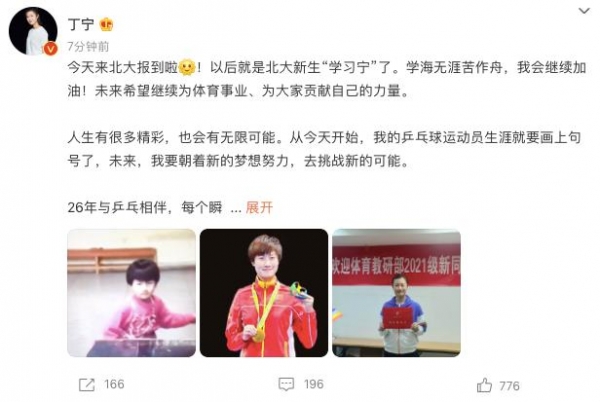北京时间9月6日,国乒大满贯丁宁开启了人生的一个新阶段。今天,丁宁正式到北大报到入学,她也调侃自己成为“学习宁”。值得一提的是,丁宁也正式宣布了退役的决定。