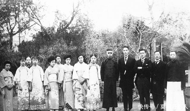 图:伪满洲国成立后,溥仪携婉容,妹妹在日本东京会见天皇,留影上的有日本政界高官和他们的夫人,