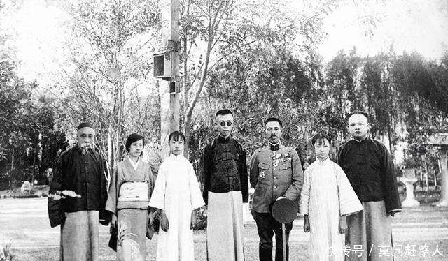 溥仪携三妹,四妹会见日本关东司令官,期间留下此合影,