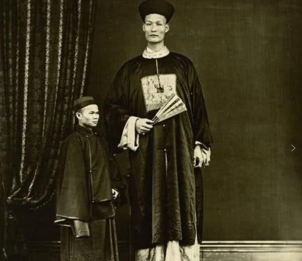 这是晚清年间的乡村巨人詹世钗和一位普通身高男子的合影,据史书记载晚清年间的詹世钗出生在道光年间,据文献资料记载晚清詹世钗身高八尺,也就是约2.48米左右,而且据说其父亲和兄弟身高均是如此,可见应该其身高应该是家族遗传。