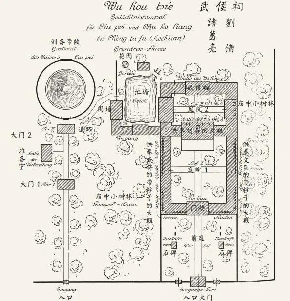 武侯祠始建于章武三年(223年),原是纪念诸葛亮的专祠,后合并为君臣合祀祠庙,是全国唯一的君臣合祀祠庙和最负盛名的诸葛亮、刘备及蜀汉英雄纪念地,也是全世界影响最大的三国遗迹博物馆,有"三国圣地"之美誉。20世纪初,德国建筑学家伯施曼到成都考察了武侯祠的建筑,留下了珍贵的考察记录。