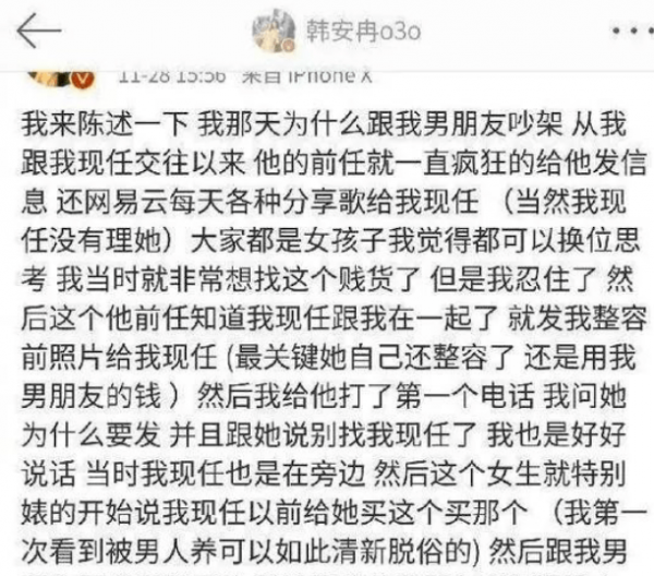 推测他们是在当年9月恋爱,两个月后就开始第一次互撕,矛盾原因是韩安冉发现小猪总是与前任联系。