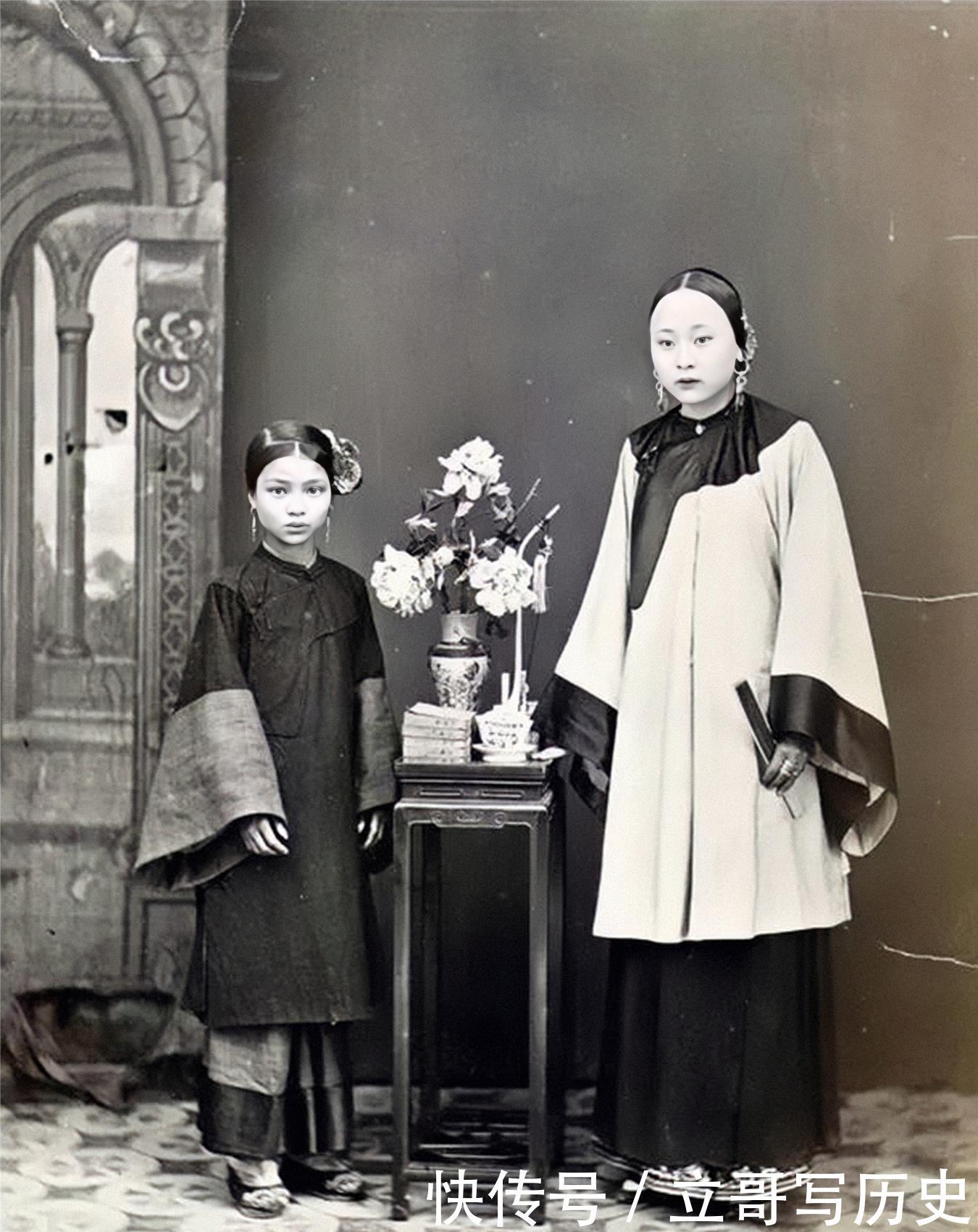 长期以来,古代将平民分为士、农、工、商四类,虽然每个时代都出了很多大商贾,但就社会地位来说,他们的地位依然抵不上一个穷秀才。历史上最著名的有四大商帮:晋商、徽商、浙商、粤商,其中各有百年辉煌的晋商和徽商早已经没落,而浙商和粤商至今仍是经济主体。图为清光绪四年,一个浙商家庭中的妻子和小妾,虽然衣着并不算华丽,但依然能看出贵妇气质。
