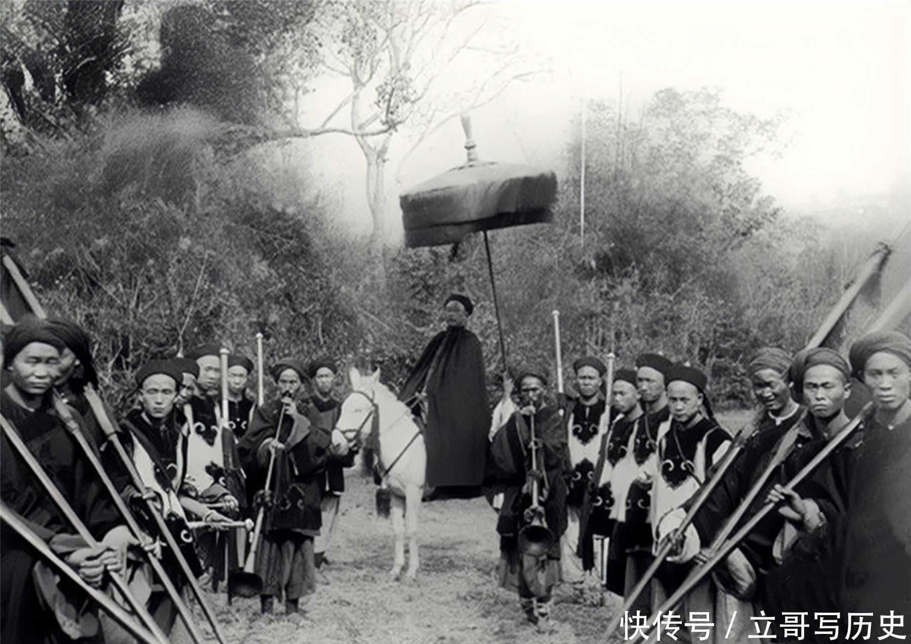 由于受影视剧的影响,很多人都以为清朝的七品官员是非常小的官,名曰芝麻官,但清末真实的七品官在出行时有很高的规格,《大清会典》中对县官的出行仪式有详细规定:青旗四、蓝伞一、青扇一、铜棍、皮槊各二。其中铜棍和皮槊都是武器,一来可以保护县官的安全,二来也体现了县官的威严。图为清末的一个七品官,骑着马,脸上写满了骄傲之情。