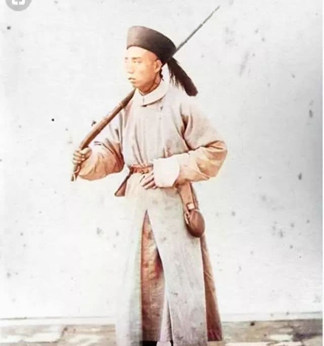 清兵扛着鸟枪,腰间的那个是壶应该是放置弹丸的。