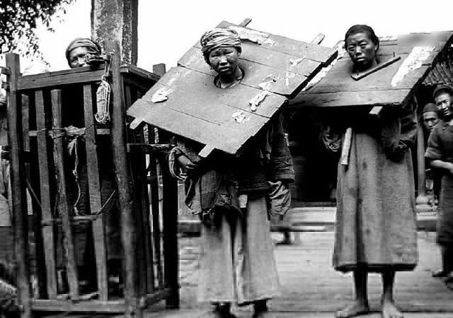 图3:在中国古代,各种刑罚非常的多,而且十分残酷,但是都没有留下照片,唯有距离我们最近的清朝,留下了不少刑罚的照片。清朝的刑罚比其他朝代有过之而无不及,主要有笞、杖、徒、流、死五种法定刑罚。照片上头戴夹板面露凶光,连脚都没有裹,可见这女的也是位传奇人物!