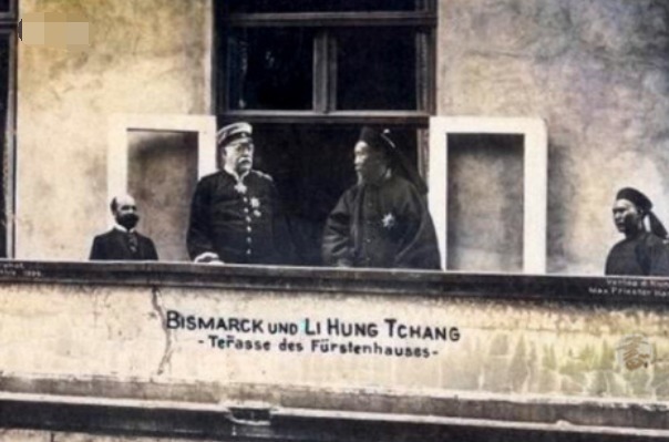 照片为李鸿章出访德意志时与俾斯麦在阳台合影,李鸿章当时被喻为是东方俾斯麦,对于大清王朝而言,他也是让清王朝再度崛起的人物。