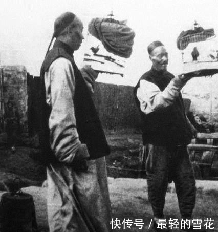 晚清真实老照片:图为晚清的两个八旗子弟提着鸟笼在玩耍。