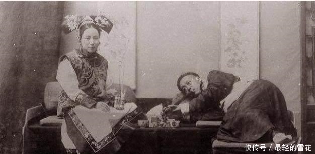 晚清真实老照片:图为一个满族家庭,一个贵公子正斜躺着吸食鸦片,他的夫人坐在一旁伺候。