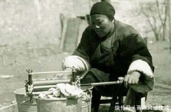 清朝时期,一位正在洗衣服的妇女。不过她使用的是"洗衣机",这种"洗衣机"构建简单,通过手摇来产生动力,旁边还放着洗衣粉。可见这位妇女家中生活富足殷实。