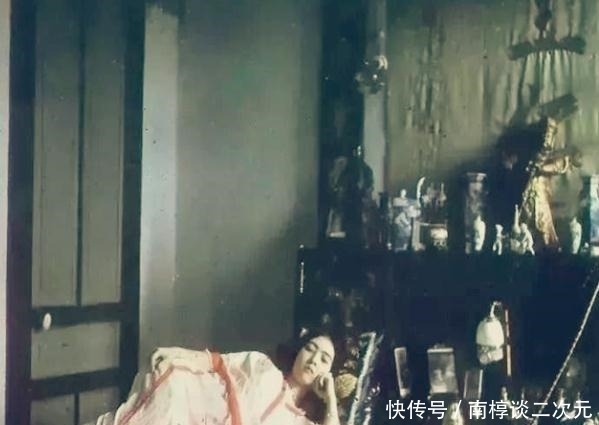 吸食完鸦片的女子。照片中一位刚吸食完鸦片的贵族女子正侧卧在榻上,此时的她还处于迷迷糊糊状态。