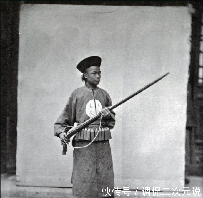 清朝真实老照片:晚清时期的士兵,这位士兵长相清秀,似乎年龄并不是很大;其实那时候许多年龄不大的青年顶替八旗士兵来参军。