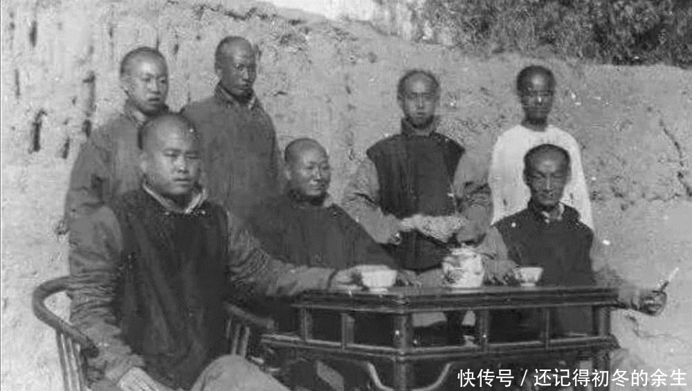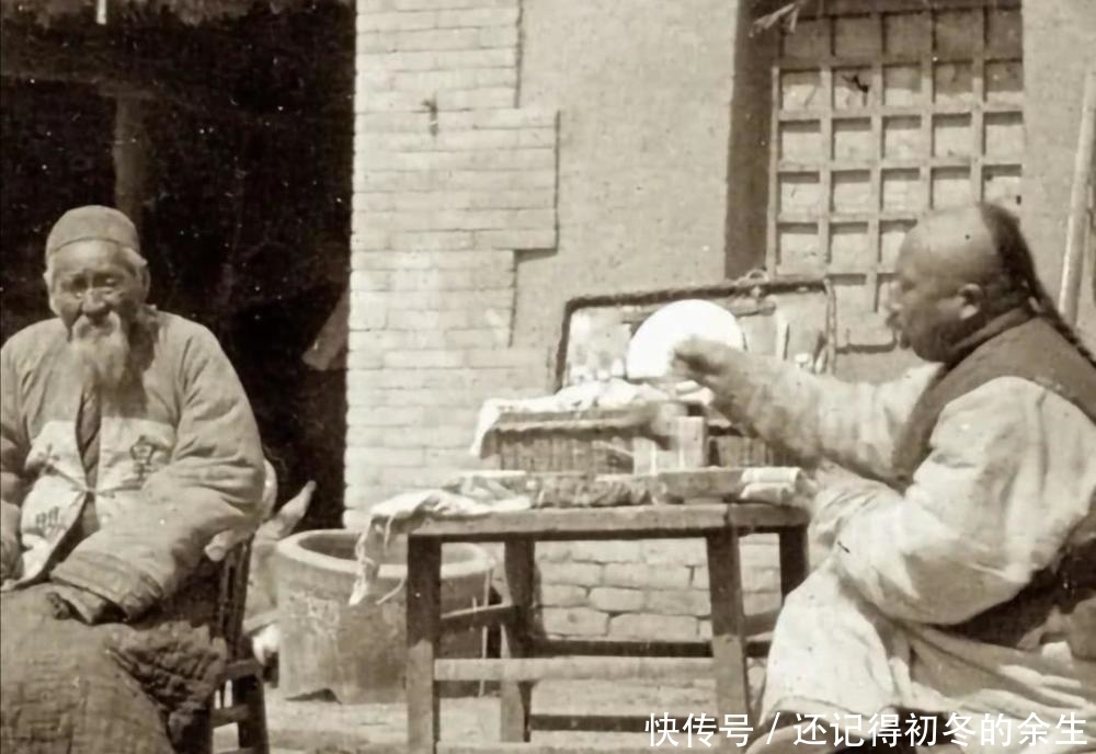 八旗后裔穿御赐黄马褂在自家院子里晒太阳,右边是他的儿子,盘着二郎腿赋闲在家。爷俩都是啃老族,祖上的那点荣光几乎殆尽。一般情况黄马褂需要供着,朝廷举行大典才能穿。可随着家道中落,有的八旗后裔成了败家子。变卖田产,数典忘祖。这黄马褂若是留到现在,可值钱了吧!