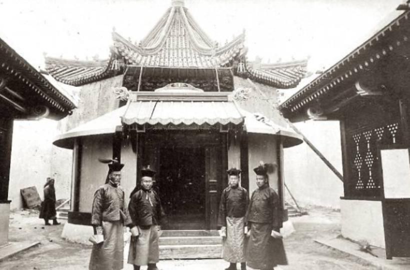 晚清蒙古罕见老照片:图为清末库伦的官府,门口站着四个蒙古男人。