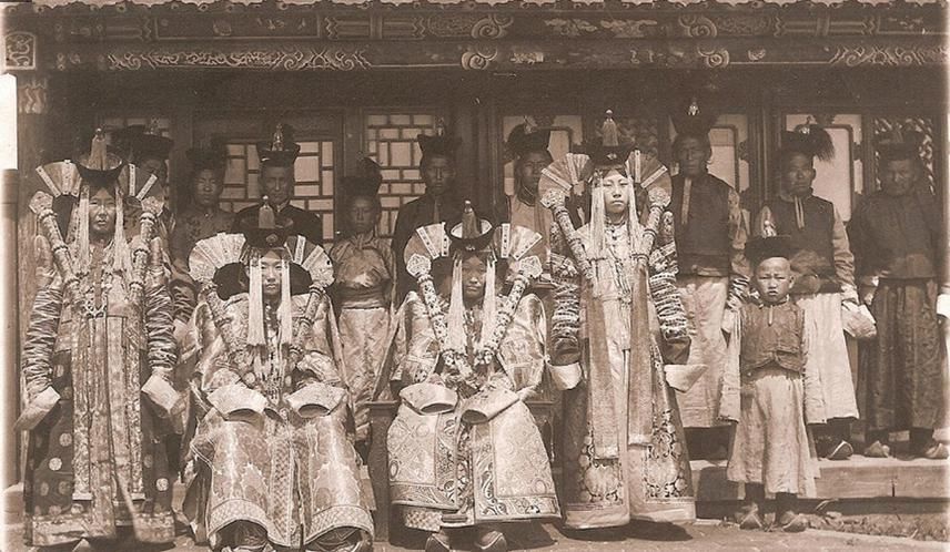晚清蒙古罕见老照片:图为喀尔喀蒙古族的一个贵族家庭,4位贵妇的头饰形状似牛角,以金银为饰,十分的珍贵
