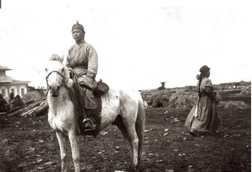 晚清蒙古罕见老照片:图为一个穿着清朝服饰的蒙古人骑着马。
