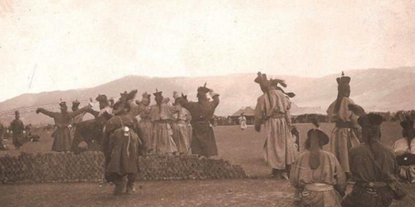 晚清蒙古罕见老照片:图为一群蒙古人在草原上载歌载舞。