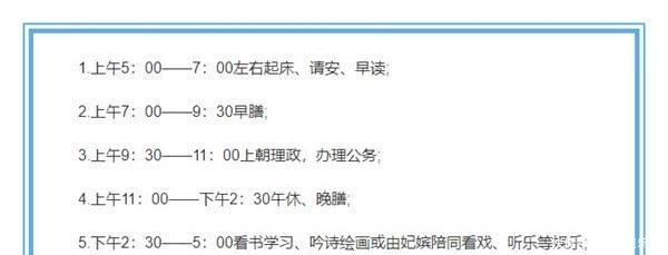 清朝皇帝长寿还有一个原因就是他们作息规律,他们的作息时间是有严格要求的,一般是早上五点起床梳洗,然后去给太后、太妃、太嫔请安,接着读《圣训》;七点你开始吃早饭;九点半开始就是工作时间了,需要处理政事;十一点以后皇帝会单独留下个别大臣对政事进行深入交流,然后吃晚膳,午休;两点半开始继续处理政事;五点以后会吃一些点心,然后拜佛念经;九点睡觉。当然像雍正帝这种一天只睡四个小时的工作狂人肯定不是这么作息的,所以他最后也是过劳而死。