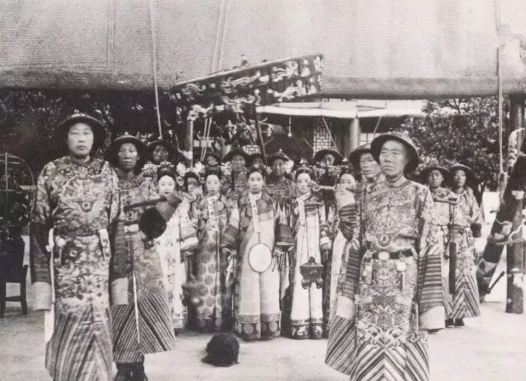 慈禧太后出行照,排场很大,在太监们的引导和宫女们的簇拥下,缓缓向前走。