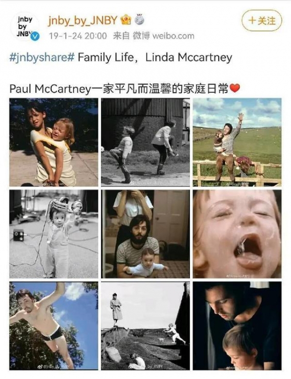 观察者网发现,相关图片来自@jnby_by_JNBY 于2019年发布的分享微博,带有话题“jnbyshare”,图源是英国音乐人、前披头士乐队成员保罗·麦卡特尼与其第一任妻子琳达·伊士曼(婚后随夫姓)的家庭照。目前,该微博已被删除。