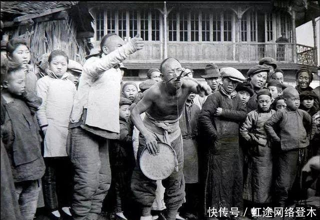 图:街头表演艺人,以牺牲身体为代价,看的观众目瞪口呆。