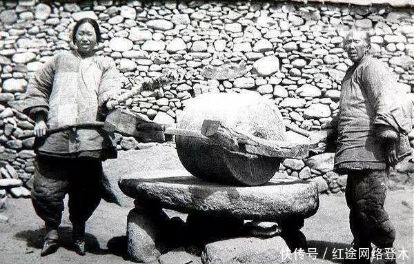 图:小脚推石碾婆媳,也许他们是在磨面。
