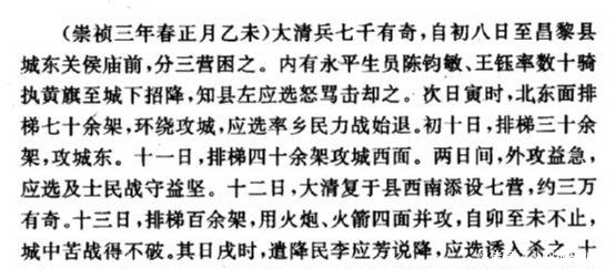 以昌黎城为例,后金从正月初十到正月十四日,四次攻城,城内知县左应选坚决不降,誓死抵抗,结果后金军用尽办法,始终无法破城。