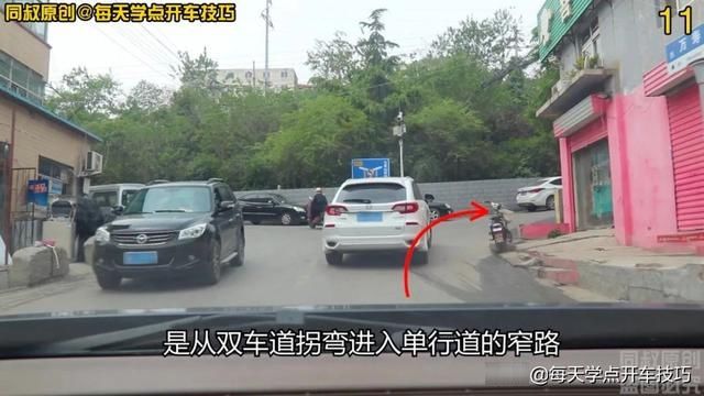 注意前面白车,虽然车身不是太长,但是他与右侧电动车的距离也是保持很远,在这里已经可以看到拐过去以后,左侧路边停的有车辆。