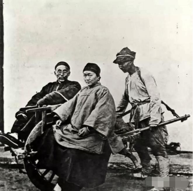 地主老财和地主婆坐在独轮车上,由帮工推着。