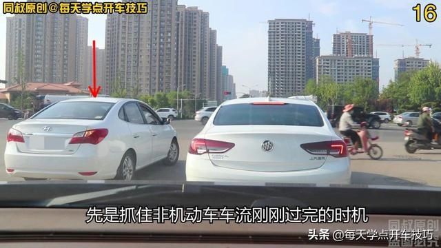他短暂停留后,找到机会,先是抓住非机动车车流刚刚过完的时机,立即右转向右摆斜前行,