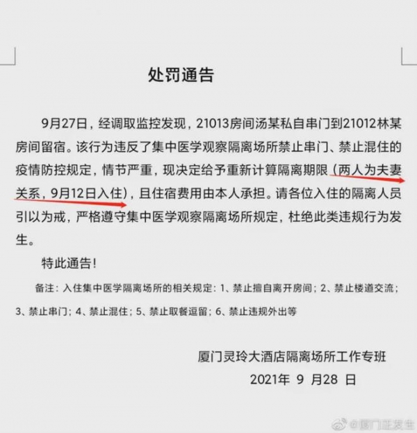 9月27日,经调取监控发现,21013房间汤某私自串门到21012林某房间留宿。该行为违反了集中医学观察隔离场所禁止串门、禁止混住的疫情防控规定,情节严重,现决定给予重新计算隔离期限(两人为夫妻关系,9月12日入住),且住宿费用由本人承担。请各位入住的隔离人员引以为戒,严格遵守集中医学观察隔离场所规定,杜绝此类违规行为发生。特此通告! 并附有备注:入住集中医学隔离场所的相关规定: 1、禁止擅自离开房间;2、禁止楼道交流;3、禁止串门;4、禁止混住;5、禁止取餐逗留;6、禁止违规外出等。最后落款为“厦门灵玲大酒店隔离场所工作专班”,时间为2021年9月28日。