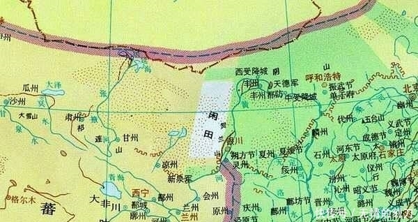 中国历史地图集的唐时期全图三和元和方镇图中的闲田是指唐朝在建中四年(783年),与吐蕃第六次会盟、第三次议定边界的清水会盟议定的边界。
