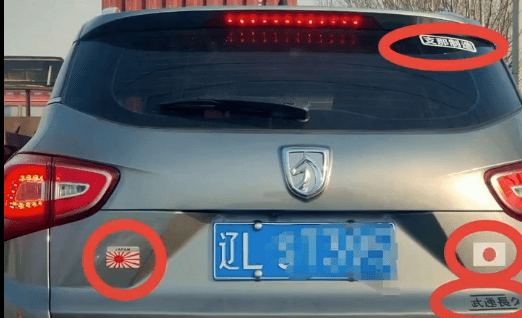 从视频中可以看到,涉案车辆的后方贴着日本国旗、日本军旗、“支那制造”和“武运长久”的贴纸。公安民警发现后,第一时间对其进行传唤。