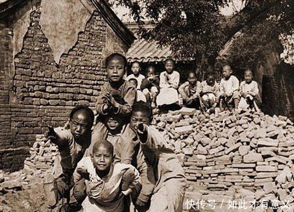 第二张晚清老照片:上面有两伙孩子,前边的一伙孩子是杂技团的,他们在练习叠罗汉,希望在正式演出的时候多得几个赏钱,后边一伙孩子是一些附近的孩子,同样是这个年纪,有的人负重前行,有的人在享受童年,真是差距啊。